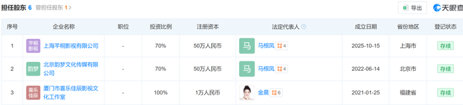 天眼查显示,金晨关联6家企业,其中3家为存续状态,包括上海芊桐影视有限公司、北京韵梦文化传媒有限公司、厦门市喜乐佳辰影视文化工作室,金晨在上述企业中持有股份,版图涉及影视、文化传媒领域。